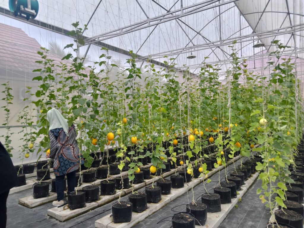 “Alhamdulillah, kita sudah punya greenhouse yang dibantu Dinas Pertanian dan Peternakan. Hari ini kita bisa lihat langsung hasil panen melon dengan sistem hidroponik. Jadi, media tanamnya bukan tanah, tapi sekam yang dialiri nutrisi sesuai kebutuhan, melalui instalasi ke masing-masing polybag,” jelasnya.