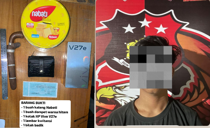 “Setelah masuk ke dalam rumah pelaku masuk ke dalam kamar lalu membongkar lemari dan mengambil 1 unit handpone merk Vivo V27E warna hitam , Uang titipan Dasa Wisma sebesar Rp 1,3 juta ,Uang di dompet sebesar Rp 1,3 juta dan Uang simpanan di dalam kaleng sebesar Rp. 700 ribu. Akibat kejadian tersebut, korban mengalami kerugian sebesar Rp 7.8 juta,” tambahnya.